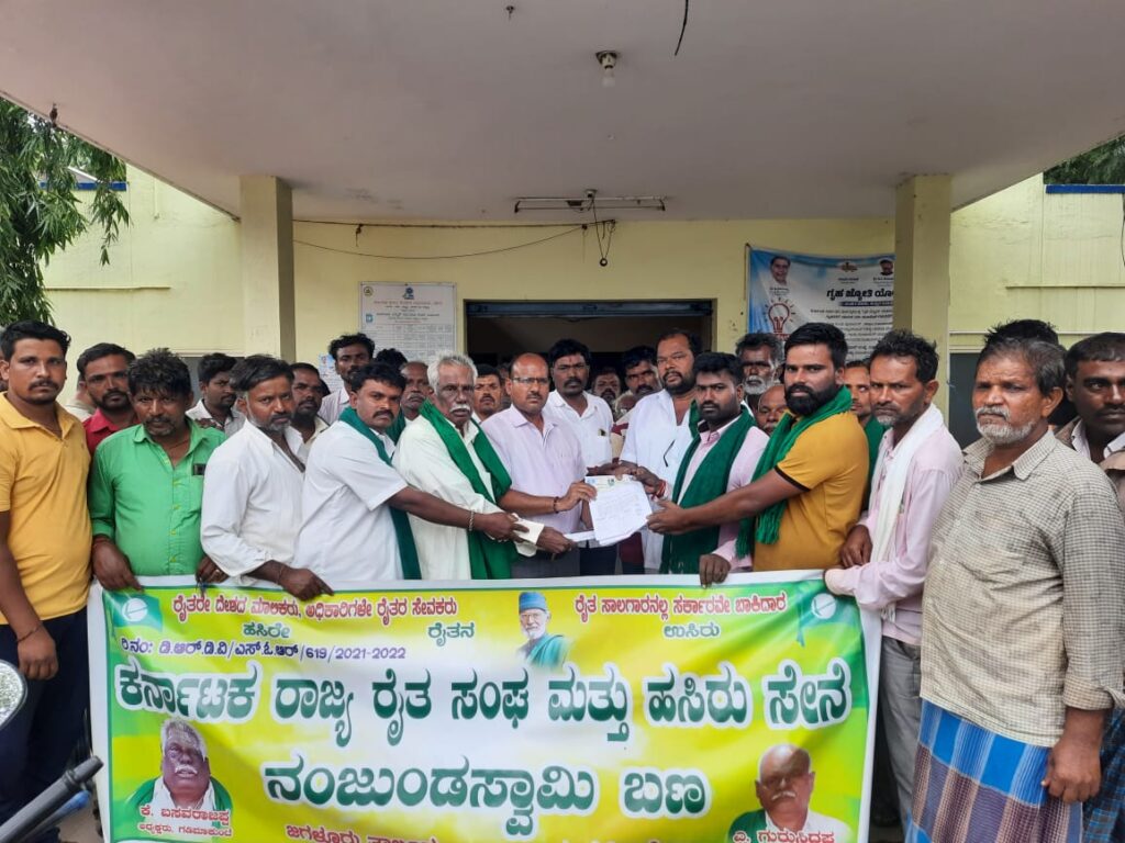 ಕರ್ನಾಟಕ ರಾಜ್ಯ ರೈತ ಸಂಘ ಹಸಿರು ಸೇನೆ ನಂಜುಂಡುಸ್ವಾಮಿ ಬಣದ ಪದಾಧಿಕಾರಿಗಳು ಪಟ್ಟಣದ ಅತ್ತಿರದ ಬೆಸ್ಕಾಂ ಇಲಾಖೆಗೆ ತೆರಳಿ ರೈತರ ಪಪಂಸೆಟ್ ಗಳಿಗೆ ಹಗಲು ವೇಳೆ ವಿದ್ಯುತ್ ಪೂರೈಸುವಂತೆ ಆಗ್ರಹಿಸಿ ಬೆಸ್ಕಾಂ ಇಲಾಖೆ ಸಹಾಯಕ ಇಂಜಿನೀಯರ್ ಗಿರೀಶ್ ನಾಯ್ಕ್ ರವರಿಗೆ ಮನವಿ ಸಲ್ಲಿಸಿ ಒತ್ತಾಯಿಸಿದರು.