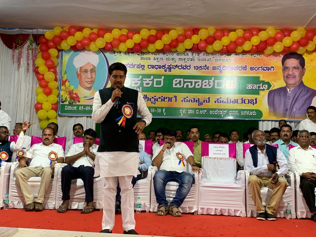 ಜಗಳೂರು ಪಟ್ಟಣದ ಡಾ ಬಿ ಆರ್ ಅಂಬೇಡ್ಕರ್ ಭವನದಲ್ಲಿ ಡಾ ಸರ್ವಪಲ್ಲಿ ರಾಧಾಕೃಷ್ಣನ್ 135 ನೇ ಜಯಂತಿ ಅಂಗವಾಗಿ ಶಿಕ್ಷಕ ದಿನಾಚರಣೆ ಉದ್ಗಾಟನೆ ಕಾರ್ಯಕ್ರಮದಲ್ಲಿ ಕಾರ್ಯಕ್ರಮವನ್ನುದ್ದೆಶಿಸಿ ಮಾತನಾಡಿದರು