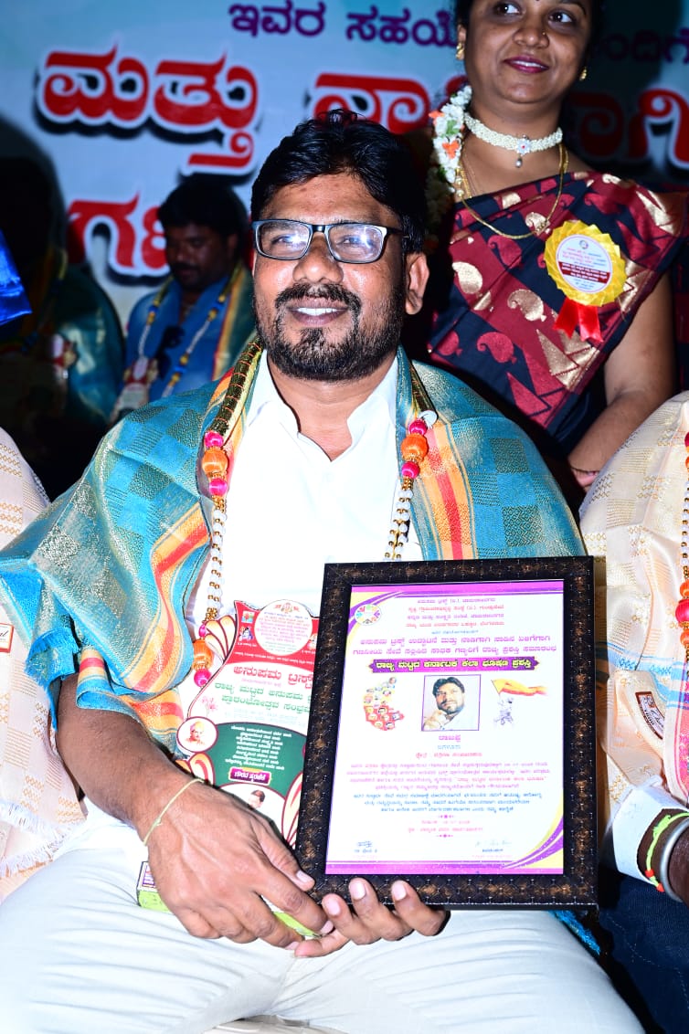 ರಾಜ್ಯ ಯುವ ಬರಹಗಾರರ ಒಕ್ಕೂಟ ಹಾಗೂ ಅನುಪಮ ಟ್ರಸ್ಟ್( ರಿ)ಮತ್ತು ಕನ್ನಡ ಸಂಸ್ಕೃತಿ ಇಲಾಖೆ ವತಿಯಿಂದ ಚಾಮರಾಜ ನಗರದ ವಾಲ್ಮೀಕಿ ಭವನದಲ್ಲಿ ಏರ್ಪಡಿಸಲಾಗಿದ್ದ ವಿಚಾರ ಸಂರ್ಕೀಣ ಮತ್ತು ಸಾಧಕರಿಗೆ ಸನ್ಮಾನ ಕಾರ್ಯಕ್ರಮದಲ್ಲಿ ಶುಕ್ರದೆಸೆ ನ್ಯೂಸ್ ಮೀಡಿಯಾ ಸಂಪಾದಕ ಎಂ.ರಾಜಪ್ಪ ವ್ಯಾಸಗೊಂಡನಹಳ್ಳಿ ಇವರಿಗೆ ರಾಜ್ಯಮಟ್ಟದ ಕರ್ನಾಟಕ ಕಲಾ ಭೂಷಣ’ ಪ್ರಶಸ್ತಿ ನೀಡಿ ಗೌರವಿಸಿದೆ